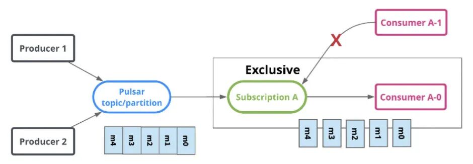 Exclusive 下,只允许 Subscription 存在一个消费者,如果多个消费者使用同一个订阅名称去订阅同一个 Topic ,则会报错。