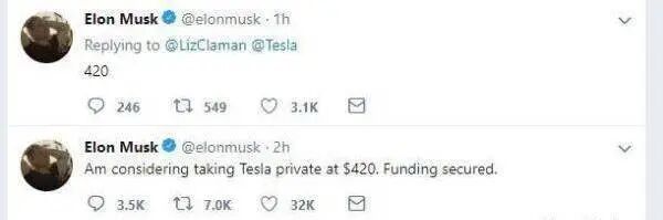 从2014年达成这个合约之后的几年里,都无事发生,直到2018年马斯克手痒,发了那条可谓“臭名昭著”的推文:"考虑以每股420美元的价格将特斯拉私有化。资金已经到位。"