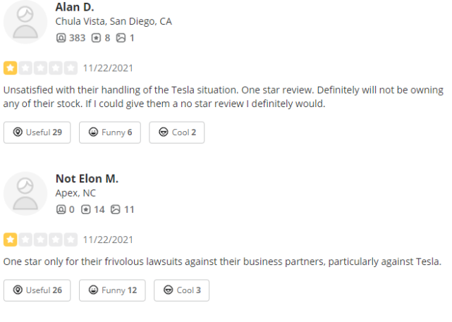 当摩根大通在2021年11月对特斯拉提起诉讼之后,马斯克还不无戏谑地表示:“如果摩根大通不撤销诉讼,我会在Yelp(美国最大点评网站)上给他们一星差评。”并补了一句,这是对摩根大通的“最后通牒”。