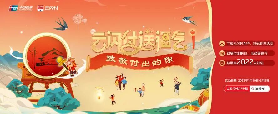 据悉,中国银联将联合商业银行进军“春节档”,推出“云闪付送福气 致敬付出的你”新春活动,致敬全体付出者。该活动将从1月19日(本周三)开始,一直持续到2月5日。