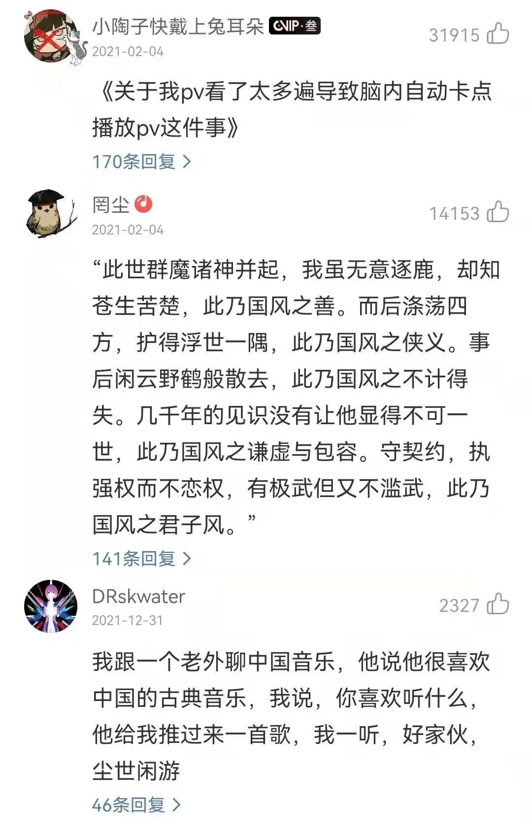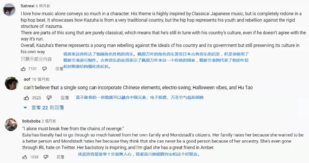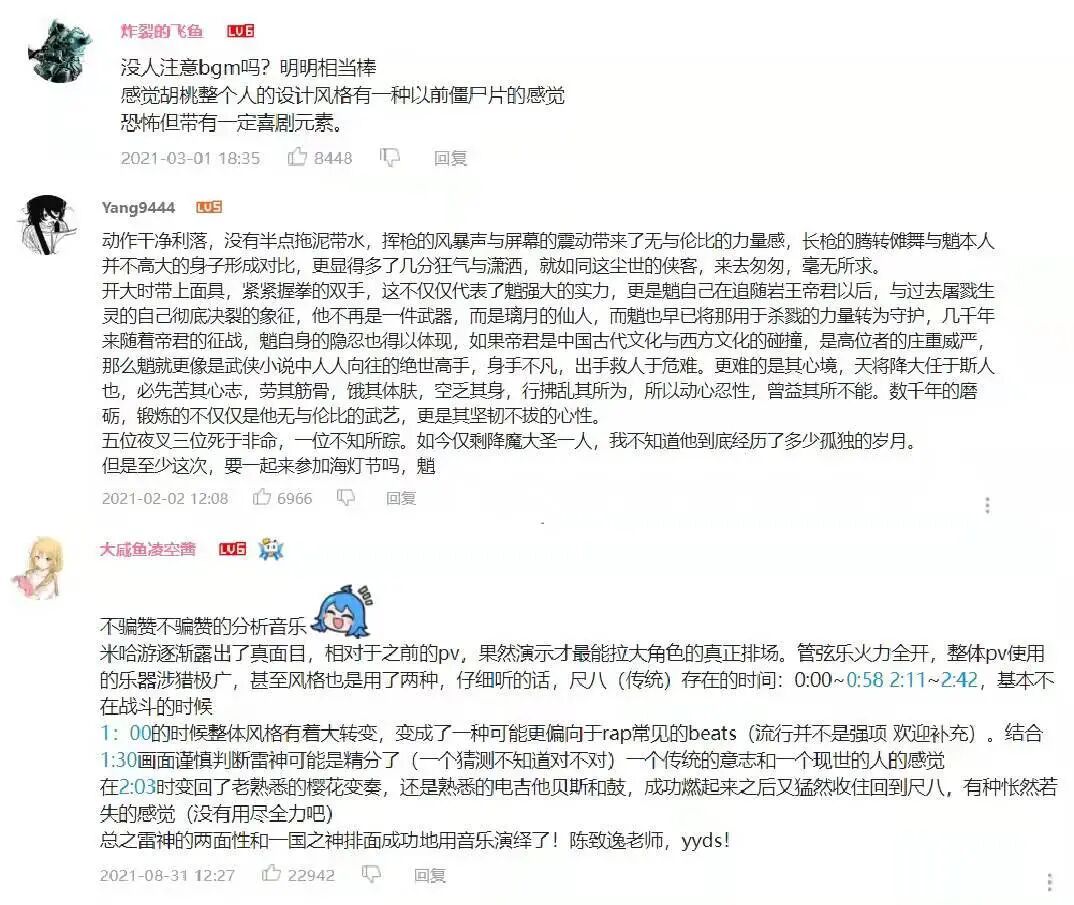 正是在这些为各个角色量身定制的音乐的烘托下,魈、胡桃、神里绫华、优菈和雷电将军等角色才得以更加立体地呈现出来,才能让玩家们在对角色或怜爱,或感慨,或感动的情感链接下,一次又一次地重温专属他们的旋律,并用心地留下一条条走心的评论。