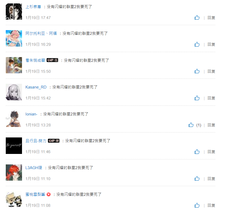 目前在《闪耀的群星》专辑下,我们还能看到大量意犹未尽的玩家留下的“没有闪耀的群星2,我要‘死’了”的催更评论。