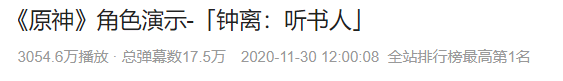 钟离角色音乐在B站播放量已经超过3000万