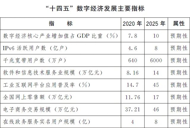 新一代信息技术产业正在掀起“第四次工业革命”,在“十三五”时期,通信产业、软件与信息产业、大数据产业已得到快速发展。而随着产业本身逐渐壮大,信息技术产业赋能实体经济成为“十四五”时期的发展重点。1、数字经济增加值要占GDP达10%,强调工业互联网2021年12月12日,国务院印发《“十四五”数字经济发展规划》,指出到2025年我国数字经济核心产业增加值占国内生产总值(GDP)比重要达到10%。除此之外,国务院在IPv6和千兆宽带用户、软件和信息技术业规模、工业互联网平台应用普及率、全国网上零售额、电子商务交易规模、在线政务服务实名用户等方面都给出明确指标。![]()