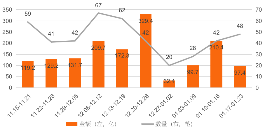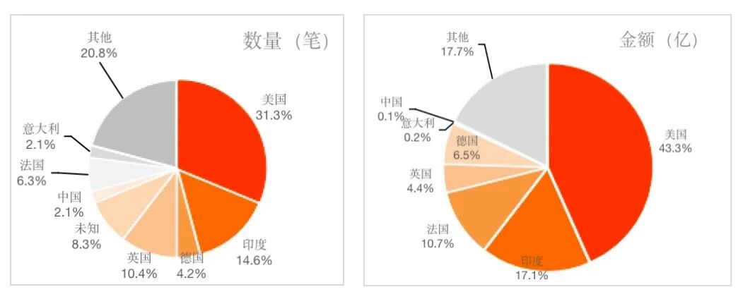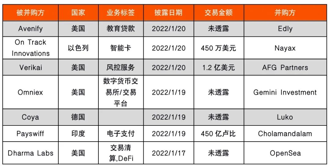 据零壹智库不完全统计,上周(2022年1月17日-2022年1月23日)全球范围内与金融科技相关的股权融资事件为48笔,环比增加14.3%;公开披露的融资总额约97.4亿元,环比减少53.7%。整体而言,投资活跃情况呈稳步上升趋势。种子/天使轮融资15笔,早期融资(A轮和B轮系列)22笔,融资总额53.3亿元;C轮及以后融资9笔,融资总额43.9亿元。其中,本周无10亿元以上的融资,均为1-10亿元之间的融资;本周最大融资项目为美国数字资产投资平台“iTrustCapital”获投的1.25亿美元A轮融资,该轮融资由Left Lane Capital领投;中国区块链解决方案和数字金融服务商“零数科技”完成数千万元Pre-B轮融资,本轮由成都新跃股权投资基金投资。从项目数量来看,美国获投项目攀升至15个,印度紧随其后获投7个项目,英国及法国获投项目分别为5个和3个。从披露的融资金额上看,美国融资总额42.2亿元,印度16.7亿元,法国10.4亿元,德国和英国分别为6.3亿元和4.2亿元。数量和金额占比如下图所示。(四)投资理财领域融资27.1亿元,区块链金融融资13笔按领域来看,投资理财领域融资总额高达27.1亿元,其次是支付和区块链领域,分别融资13.4亿元和12.8亿元。其中,除本周最大融资项目的美国数字资产投资平台“iTrustCapital”获投的1.25亿美元外,美国财务规划和咨询平台“Facet Wealth”完成1亿美元C轮融资,法国中小型企业支出管理平台“Spendesk”完成1亿欧元C+轮融资。据零壹智库不完全统计,上周有7家金融科技公司被并购,其中美国4家,德国、以色列澳、印度各1家。表1:金融科技并购信息汇总(2022.1.17-2022.1.23)三、17家金融科技公司股价上涨, 安硕信息一周上涨35.96%据零壹智库不完全统计,国内28家上市金融科技公司中,11家公司股价下跌,跌幅最大是嘉楠科技为-23.42%,17家公司上涨,涨幅最高是安硕信息为35.96%。在16家金融IT服务商中,13家公司上涨,涨幅超过10%的有3家,5%-10%的有8家,涨幅最大的为安硕信息;3家公司下跌,金融壹账通跌幅最高,为-8.51%。表2:金融科技上市公司数据信息(2022年1月23日)