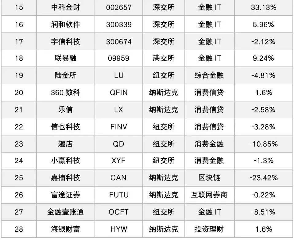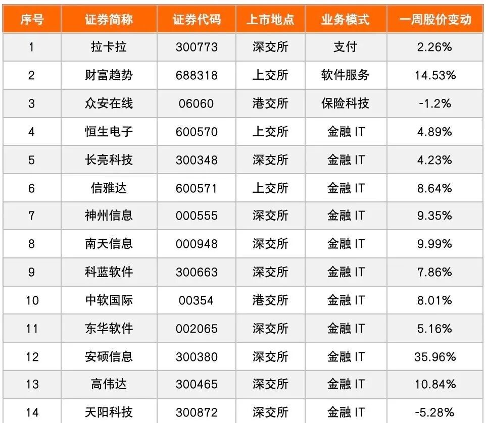 三、17家金融科技公司股价上涨, 安硕信息一周上涨35.96%
