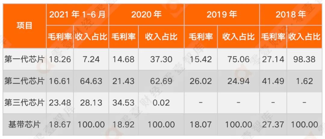 根据招股书,报告期芯片产品贡献毛利占比分别为75.3%、98.67%、60.48%及78.15%。芯片产品中毛利率更高的蜂窝基带芯片收入占比9成以上,报告期占比分别为98.17%、95.03%、90.00%和90.21%。由于技术进步,每一代蜂窝基带芯片在推向市场后毛利率都面临逐期下降的境地。根据招股书,第一代蜂窝基带芯片的毛利率从2018年的27.14%下降至2020年的14.68%,2021年上半年上升至18.26%,是因为产品结构变化,低毛利产品停售,高毛利产品继续销售;第二代蜂窝基带芯片的毛利率从2018年的41.49%逐期降至2021年上半年的16.61%;第三代蜂窝基带芯片毛利率从2020年的34.5%降至2021年上半年的23.48%。所有基带芯片的毛利率仅在2020年出现过上升,2021年上半年微降至18.67%。。