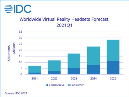 元宇宙加速了VR/AR产业的发展。未来,VR/AR会逐渐成为巨头也不能忽视的市场。据IDC数据显示,全球VR设备出货量正在提速,预计2021-2025年全球VR头显出货量将保持41%的年复合增速。预计2021年的出货量将由2020年的670万台提升到850万台,2025年更是将达到2860万台。