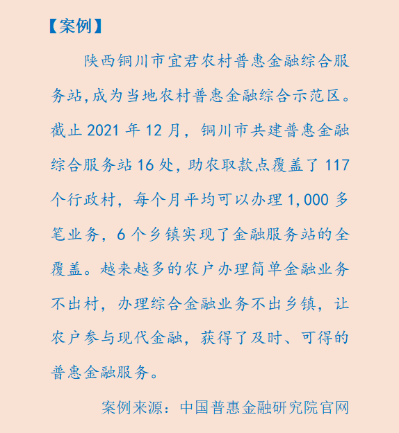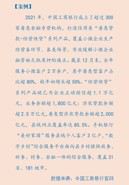 1、2021年,中国银保监会发布《支持国家乡村振兴重点帮扶县工作方案》,开启了构筑以普惠金融为核心、各类扶贫主体共同参与、各种资源要素综合运用的金融扶贫新机制,搭建了包括银行、证券、基金、保险、小额贷款、电商、物流等综合农村普惠金融服务平台,形成层次丰富、覆盖广泛、竞争有序的“大金融”扶贫格局,对消除绝对贫困和区域性整体贫困、加速国内减贫进程贡献了重要力量。截至2021年9月,全国涉农贷款余额42.64万亿元,同比增长10.1%。[ 参见中国人民银行2021年《第三季度货币政策执行报告》。] 最大限度让贫困农户、个体经营主体都可以平等享受金融服务,为我国现行标准下农村贫困人口全部脱贫、贫困县全部摘帽贡献了重要力量。2、农业供给侧结构性改革进展顺利,产业结构、产品结构不断优化,一二三产业融合发展,观光休闲农业、“互联网+”、农产品加工业、农业生产性服务业等新产业、新业态在2021年不断涌现。3、农村基础设施建设初见成效,农村人居环境治理工作机制启动,农村厕所、垃圾、污水治理成为2021年农村工作重心,村容村貌不断改善,偏远地区居民饮水安全得到高度重视,经济落后地区(乡村)道路建设持续加强,乡村治理结构更趋完善。2021年,借助互联网、云计算、大数据技术,金融科技企业、互金平台或第三方支付机构发挥网点网络、人才优势和技术优势,设立手机银行、网上银行、直销银行方式,打破物理网点约束,拓宽信贷投放范围和数量,利用全流程线上化、智能化服务不断降低金融产品利率,从个人增信、风险分担、抵押担保、支付结算进行信贷产品创新,提高了普惠金融服务广度、深度和密度,满足“长尾客户”金融需求,最大限度改变中小微企业、个体工商户、农户以及农村经济组织因资金短缺导致贫穷的状况。2021年,中国人民银行加大了信贷结构优化力度,利用定向降准实现金融服务普惠性。其中,中小金融机构法定存款准备金比率已经降至了9%,相较于之前19%的高点,下降了10个百分点,较大型金融机构低了3个百分点,为中小微企业、“三农机构”、个体工商户创造了良好的流动性环境。2021年,全球疫情形势持续严峻,央行继续发挥结构性货币政策工具作用,运用支农、支小再贷款、再贴现工具,引导金融机构加大对中小微企业、民营企业、“三农”组织等重点领域、薄弱环节的支持力度。例如,央行引导10个省份地方法人金融机构用好2,000亿元再贷款额度,新增3,000亿元支小再贷款额度,支持地方法人金融机构向受疫情影响较大的中小微企业、农户和个体工商户发放贷款,巩固脱贫攻坚成果。截止9月末,全国支农再贷款余额为4,747亿元,支小再贷款余额为9,937亿元,扶贫再贷款余额为1,904亿元,再贴现余额为5,842亿元。[ 参见中国人民银行2021年《第三季度货币政策执行报告》。]2021年,央行持续推进两个直达实体经济的货币政策工具,利用普惠小微企业贷款延期支持工具,累计向地方法人银行提供激励资金178亿元,支持对小微企业贷款延期本金共计17,833亿元,减轻了小微企业阶段性还本付息压力。截止2021年9月,全国银行业金融机构共对13.5万亿元贷款本息实施延期,累计发放普惠型小微信用贷款8.6万亿元,有效缓解了中小微企业融资难、复工复产难问题。2021年,中国工商银行、中国建设银行、中国农业银行、中国银行、交通银行和中国邮储银行均超额完成了“小微企业贷款增长30%”目标,各自下沉分支机构,向偏远地区和农村地区拓展物理服务网络,打造多层次、广覆盖、商业化普惠金融服务体系,一定程度上解决了贫困地域偏远、贫穷农户分散、物理网点不足问题。2021年,全国商业银行普惠型小微企业贷款余额17.8万亿元,同比增长29.3%,新增普惠型小微企业贷款3.2万亿元,同比增长24.6%,高于各类贷款平均增速9.7个百分点,帮助城镇新增就业800万人,优先稳就业保民生,实现全年“两增”目标。同时,普惠型贷款利率有所下降。企业类贷款年化利率为4.62%,较2020年末下降0.05个百分点。其中,普惠型小微企业贷款年化利率为5.65%,较2020年末下降0.23个百分点,五家国有大型银行新发放此类贷款利率为4.25%,为中小微企业和个人经营性贷款客户减免了60亿元费用。[ 参见《中国银保监会:上半年普惠型小微企业贷款年化利率5.65%较上年末下降0.23个百分点》,摘自《中国证券网》2021年7月30日。]1、 2021年,随着新型信息技术和大数据的日趋标准化、普及化,股份制银行、城商行、农商行、地方商业银行的技术劣势正在缓解,个性化服务、非标准化服务和供应链服务却在大幅提升普惠金融服务效率,增加了客户粘性,加之不放弃传统线下模式,本土客户基本盘和主场优势更趋明显,在助力“六稳”、“六保”方面交上了一份不俗的答卷。2、 2021年,各类农业保险、农村小额人身保险、涉农小额贷款保证保险向贫困地区倾斜,通过“保险+贴息”方式,创新“银政保”协同模式,降低了小微企业融资门槛和成本。值得一提的是,2021年推出的“气象字数保险”,把一个或几个气象条件(如气温、降水、风速等)对农作物保险标的损害程度进行指数化赔偿,新辟了一条保险行业普惠之路。目前我国气象字数保险发展势头良好。资料来源:《构建普惠金融生态体系:中国普惠金融发展报告(2021)》2021年,互联网银行通过大数据和互联网技术,利用