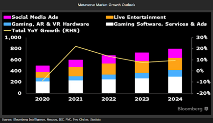 调研机构Newzoo预测元宇宙在2021年的市场将会达到400亿美元;而彭博社则是预测会达到800亿美元。无论行业未来如何,当下的资本市场已经在元宇宙概念的影响下有所动作,元宇宙有望接替新能源,成为下一个投资与投机角逐的战场。