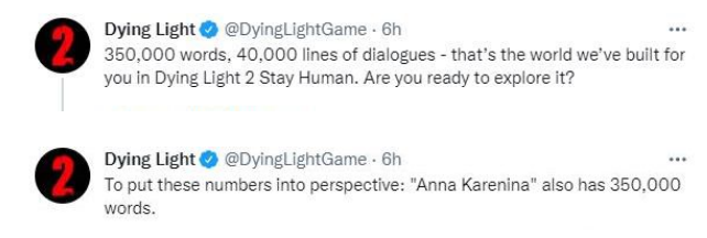 《消逝的光芒2》于今日(1月20日)在社交媒体上透露了本作的台词量,本作有350000个单词以及40000行对话,此外,官方随后还补充说道:“从字数上看,《安娜卡列尼娜》也有350000个单词。”