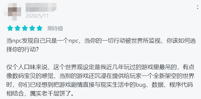 2019年公布的《隐世录》,是一款在设定上相当有野心的作品,他们企图将游戏里的“BUG”,也转变为游戏的一部分,让开发者所设计出的NPC们觉醒自我意识,以此模糊游戏与现实的边界,让玩家也成为这个虚拟空间中的一员。