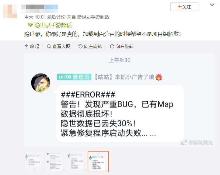 很快有玩家从中发现端倪,在游戏的官方群里流出了一些神秘的信息,《隐世录》似乎遇到了十分严重的BUG,导致一些数据开始被删除,这预示着官博消息被删的事实,而在后续的消息中,也为此后游戏是否能重启,留下了一丝悬念。