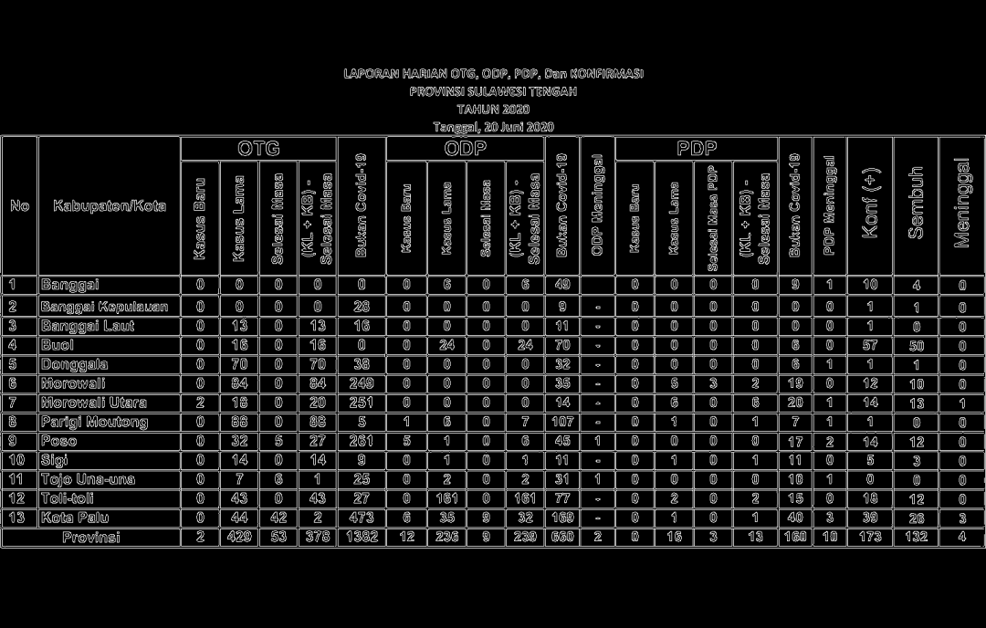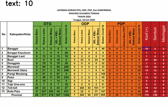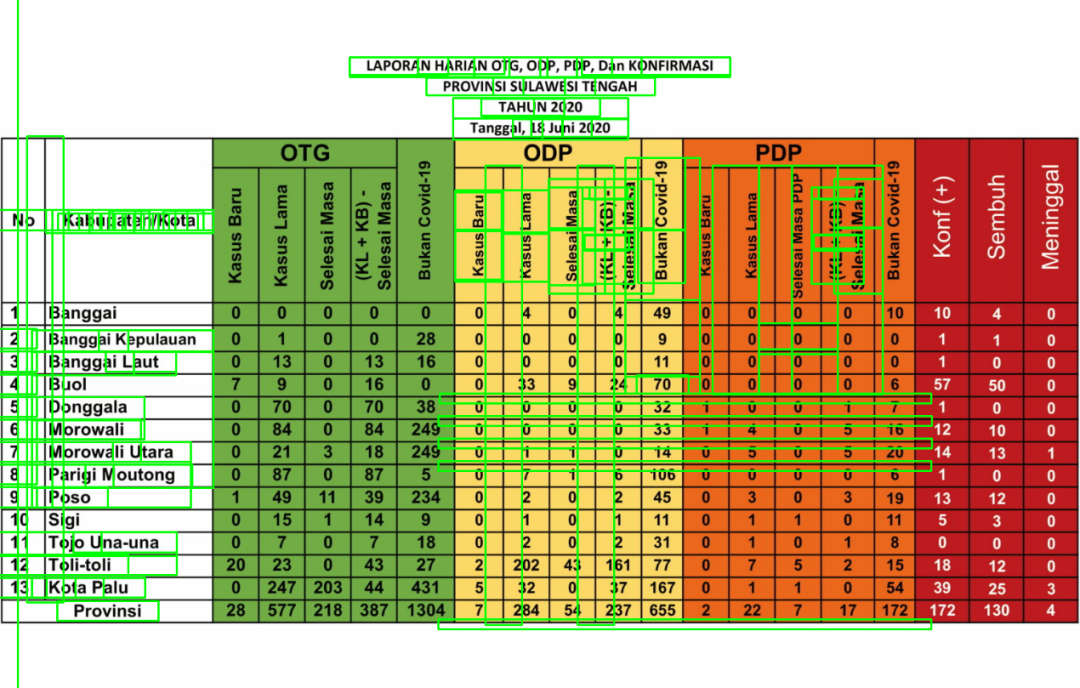 ## set keywordskeywords = ['no', 'kabupaten', 'kb_otg', 'kl_otg', 'sm_otg', 'ks_otg', 'not_cvd_otg','kb_odp', 'kl_odp', 'sm_odp', 'ks_odp', 'not_cvd_odp', 'death_odp','kb_pdp', 'kl_pdp', 'sm_pdp', 'ks_pdp', 'not_cvd_pdp', 'death_pdp','positif', 'sembuh', 'meninggal']dict_kabupaten = {}for keyword in keywords:dict_kabupaten[keyword] = []## set counter for image indexingcounter = 0## set line indexfirst_line_index = 1last_line_index = 14
