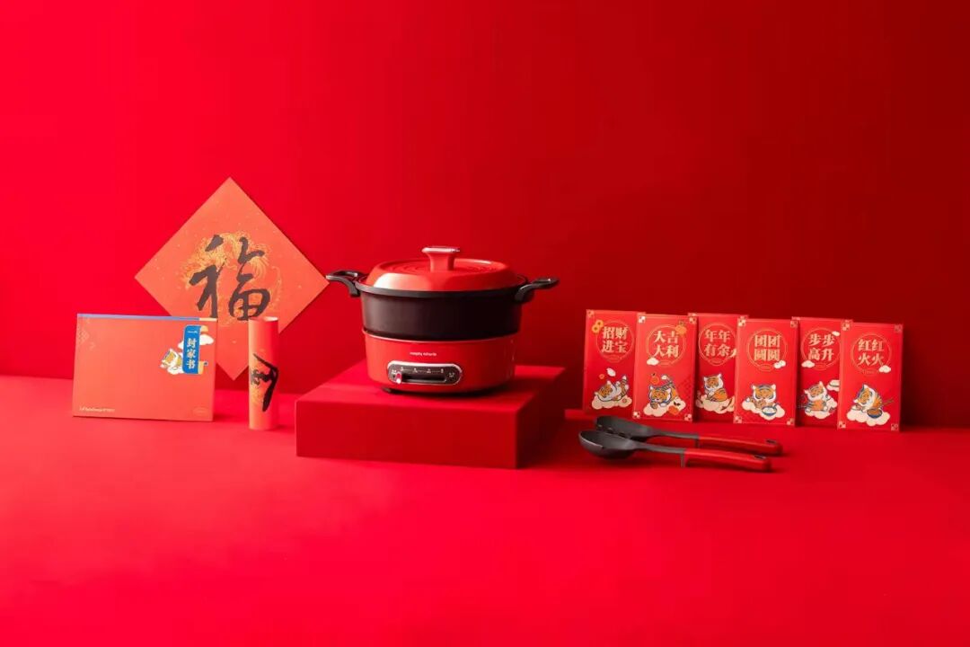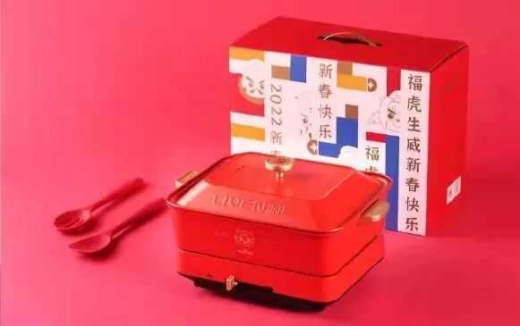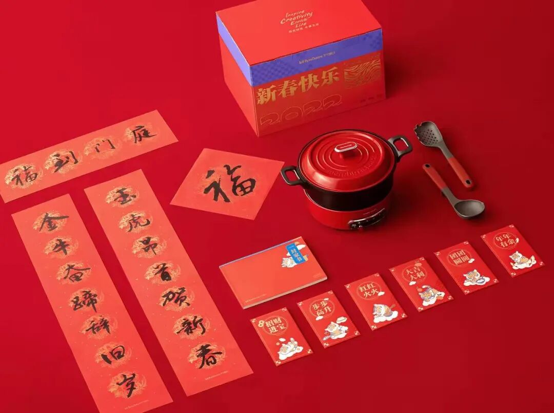 阿里家书礼盒除了一组春联福字红包窗花套装、阿里园区花草台历、虎头钥匙包和阿里动物园环保袋、虎年淘公仔外,还包含一封逍遥子张勇写给员工的家书。腾讯今年的新年礼盒主题是“焕新彩,共向善”,延续“科技向善”的企业文化。采用传承千年的传统珐琅工艺,汲取敦煌壁画中的色彩灵感,精心调制矿物颜料,手工填色完成。礼盒内容包括磁吸式台历、传统珐琅工艺打造的企鹅磁贴、笔记本、红包、春联福字等,每一样都很精致。字节跳动的春节礼品一直很务实,往年有床品四件套、行李箱,今年有些出乎意料,竟然是集涮煮炒煎焖于一体的多功能料理锅!完全符合今年“好好吃饭”的主题。礼盒包装以传统红色作为主,搭配局部虎纹烫金和蓝色点缀,年轻又俏皮,时尚又不失风雅。除了多功能料理锅外,礼盒中还包括家书、春联和红包。