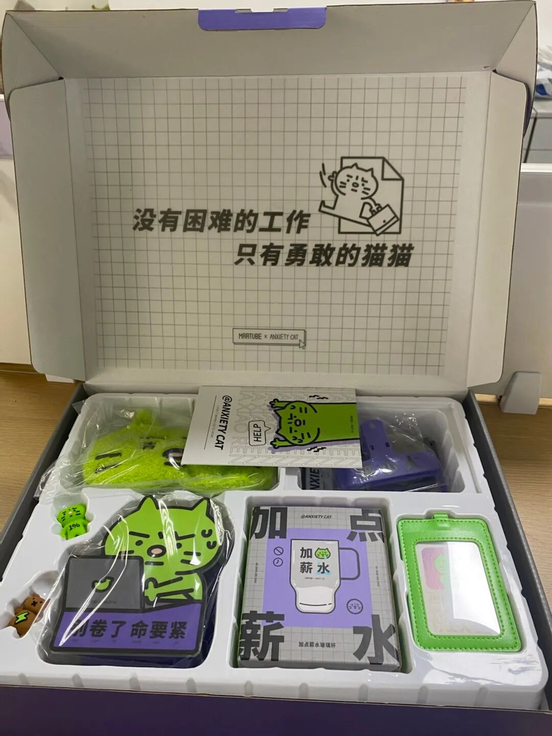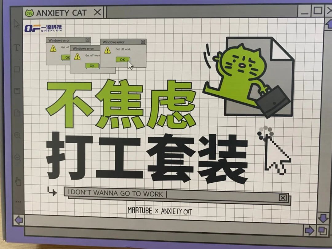 封面“不焦虑打工套装”引人注目,加点薪水玻璃杯、别卷了命要紧笔盒、清醒眼罩、不焦虑打工人工作牌、夹“小”人文件夹,文案真的是用心了!