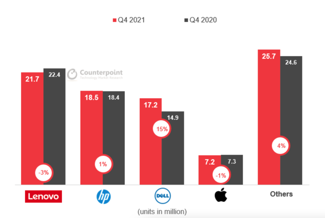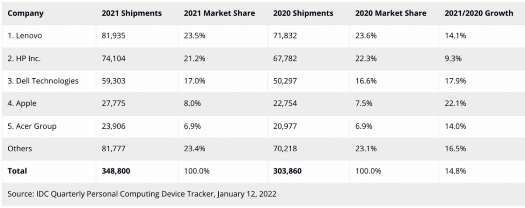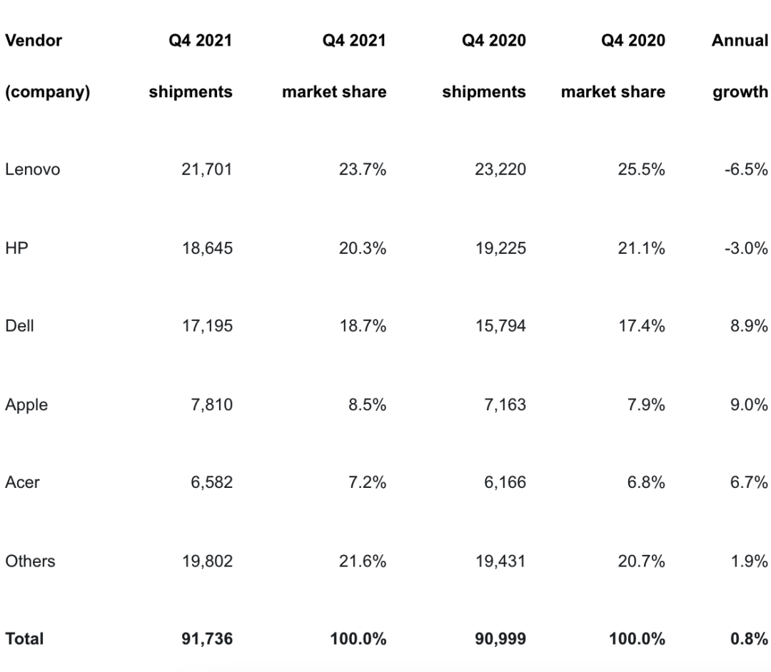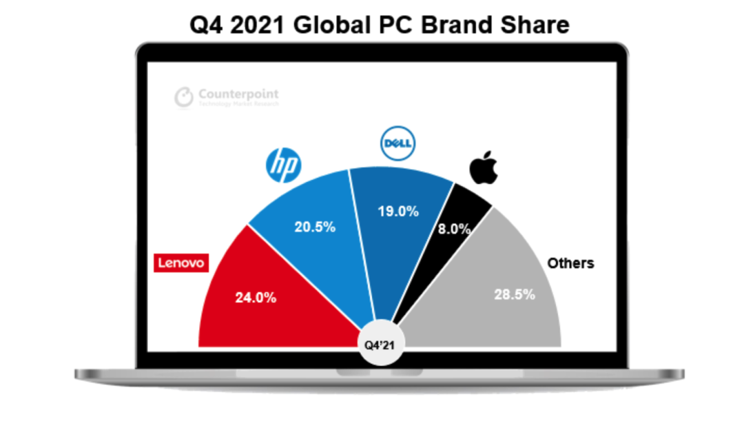 2021年Q4全球 PC 出货排名出炉:联想24%份额领跑