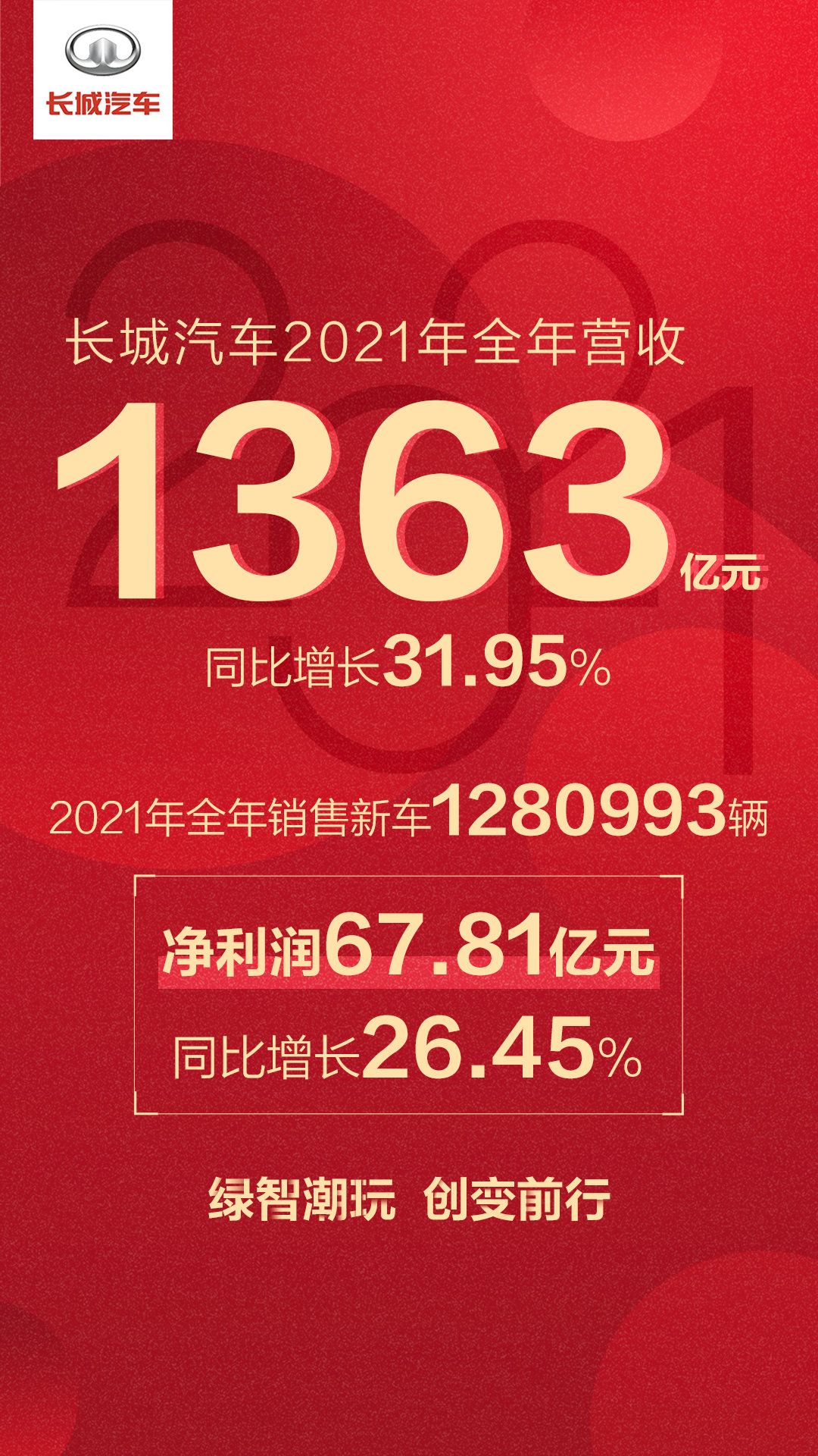长城汽车全年营收1363亿元,售出车辆128万辆