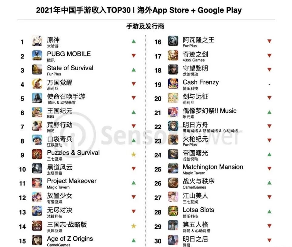 【《原神》成2021年出海手游营收最高产品】SensorTower发布2021年中国手游收入Top30榜单,《原神》超越《PUBG Mobile》(为2019、2020海外收入最高的中国手游)位列第一。此外,SensorTower还表示,2021年共有42款国产手游在海外市场的收入超1亿美元,较之2020年多了5款。