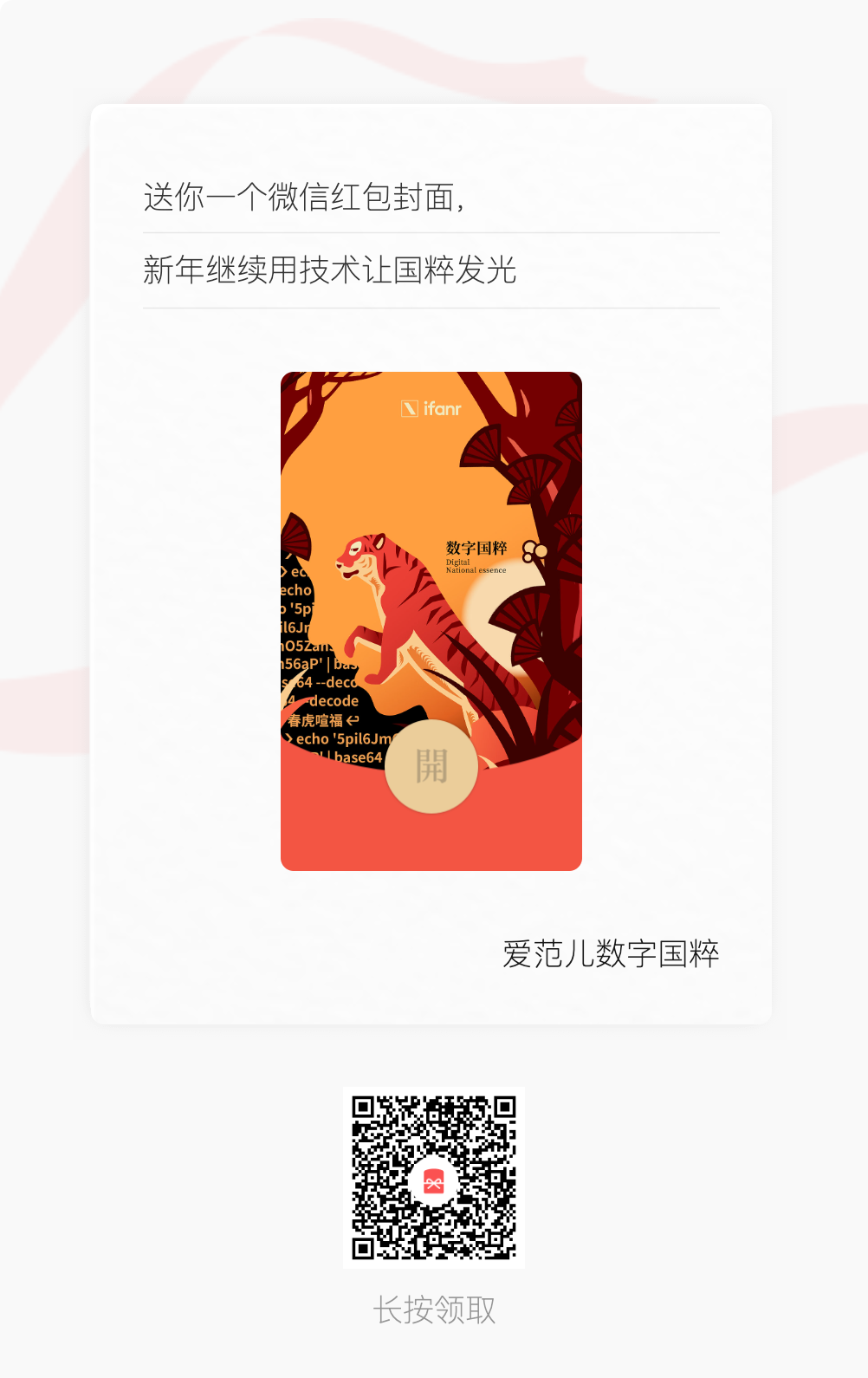 今年爱范儿出品了不少原创红包封面,甚至有朋友许下了「要集齐爱范儿红包封面」的新年愿望。当然,也有很多错失了领取机会的朋友。抓住了,这是年前最后一次机会。数字国粹是爱范儿近期推出的原创栏目,它来自我们想用技术让国粹艺术重新发光的初衷。前不久发布的第一季作品中(点击了解更多),我们将中国 300 年前的口技和今天的杜比全景声空间音频结合,在 Apple Music 上线了非遗口技专辑。希望领取到这款主题红包封面的你,和我们一起感受,用技术让前人热爱的继续被喜爱,让惊艳的继续在时间里发光。如果刚刚没有领取到,别气!还有最最最后一次机会。再如果你恰巧还期待着其他款式返场,那么下面的抽奖祝你好运。中奖率有 20%,不考验手速只拼手气!只要在限定人数内参与,都有机会抽中哦。最后抽中的朋友,欢迎来留言区晒一晒你拿到了哪款红包。![]()
