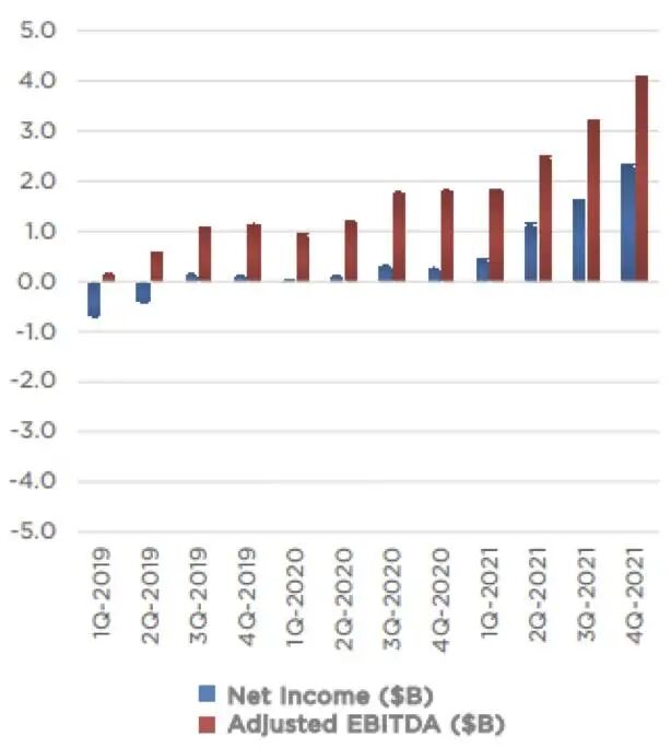 2021 年第四季度,特斯拉的总收入达到了 177 亿美元,同比增长 65%;GAAP 营业利润为 26 亿美元,实现了 14.7% 的营业利润率;GAAP 净利润为 23 亿美元,同比增长 760%。