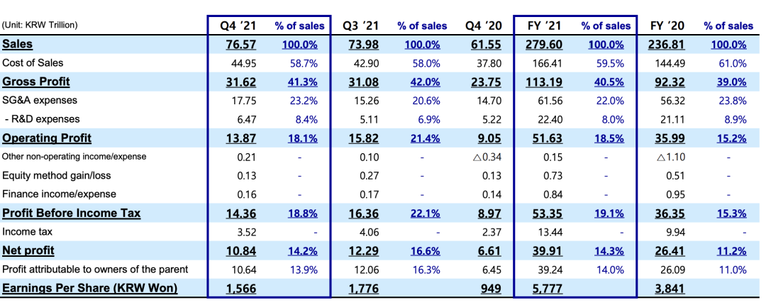 今天三星电子公布了2021年第四季度以及全年的财报,根据财报,截至2021年12月31日的第四季度,公司合并营收76.57万亿韩元(约4041亿元人民币),同比增长24.39%创造了新高;营业利润13.87万亿韩元(约732亿元人民币)。三星半导体业务第四季度综合收入26.01万亿韩元(约1373亿元人民币),营业利润8.84万亿韩元(约467亿元人民币)。2021年全年,三星电子的营收创历史新高,达到了279.6万亿韩元(约1.48万亿元人民币);营业利润51.63万亿韩元(约2725亿元人民币)。营收能够创造新高主要是由移动业务和芯片销售两大业务所推动的。不过也有分析师指出,尽管三星连续第四个季度实现营收纪录新高,但利润却低于分析师预期。限制利润增长的部分原因在于去年底三星向员工发放了特别奖金,并增加了在芯片和显示器先进生产技术方面的支出。不过三星对其芯片在今年年底前的持续需求表示乐观,并正投入资金加速开发和扩大其最新技术的生产。有分析师此前表示:“三星第四季度内存芯片销量可能减少,但价格高于我们的预期。”不过,“大规模生产先进芯片的早期成本可能会增加支出。”三星的业务需求不断上升,但支出也在增加,从而削弱了盈利能力。例如,在移动业务中,营收增加了,但营销成本影响了利润。该公司的代工业务获得了创纪录的营收,但新设备的成本削减了利润。三星电子表示,2021年的资本支出为48.2万亿韩元,其中芯片支出为43.6万亿韩元(约363亿美元)。相比之下,台积电在芯片方面的资本支出为300亿美元。