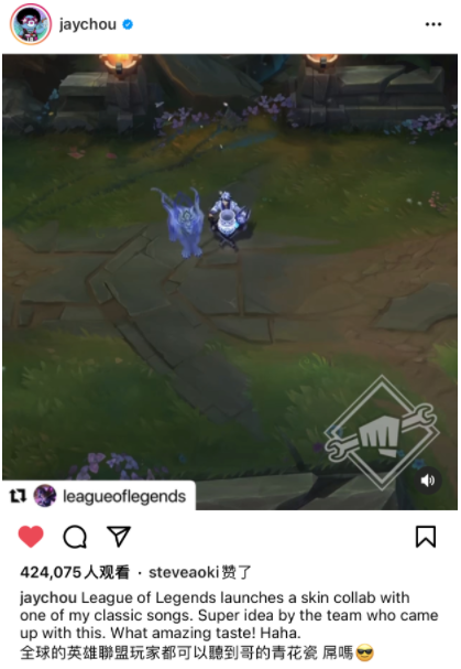 最近这次青花瓷皮肤上线,LPL又拉上解说、主持人组了个国风女团,再加上周杰伦在Ins上的引发的讨论和国外玩家群体间的传播,迅速在全世界范围内引起了讨论,也让中国传统文化通过一种年轻人更乐于接受的方式进行了推广。