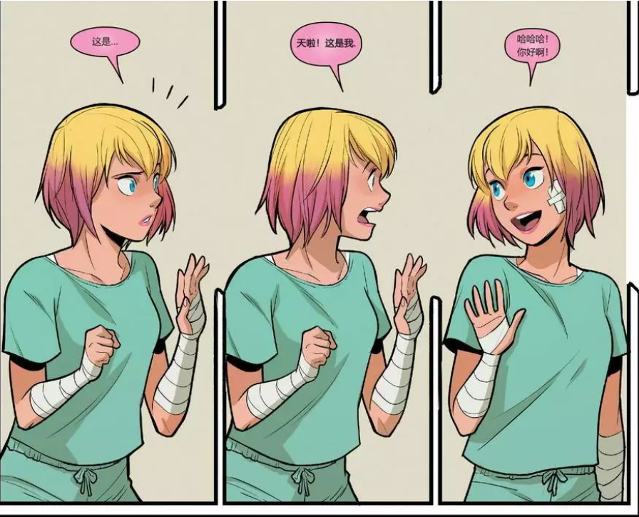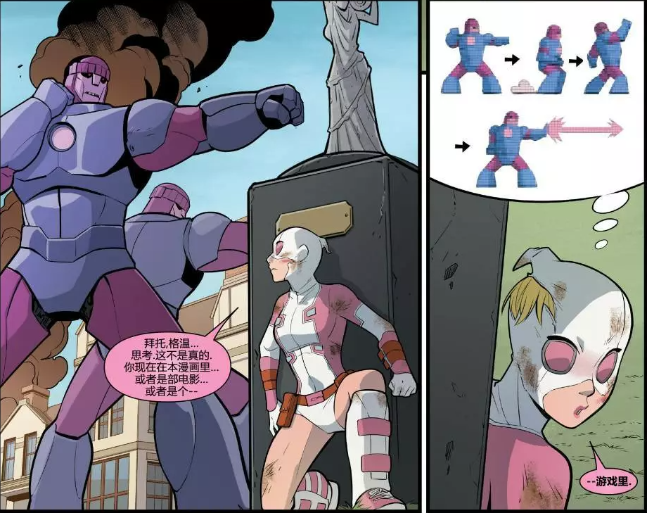 如果说死侍是打破了“第四面墙”,能意识到自己是一个漫画人物;那么格温侍则恰恰相反,她越过了“第四面墙”跳入漫画世界中,带着来自现实的行为逻辑。