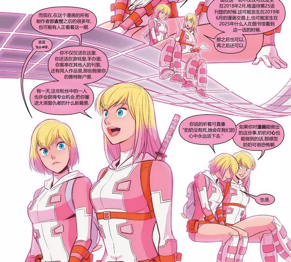 但事实上这部漫画的整体结构颇为完整,层层铺垫,最后一期更是一改此前插科打诨的反讽风格,让同时具有“读者”和“剧中人”双重身份的格温侍重新审视了“超级英雄漫画”这一类作品的意义。