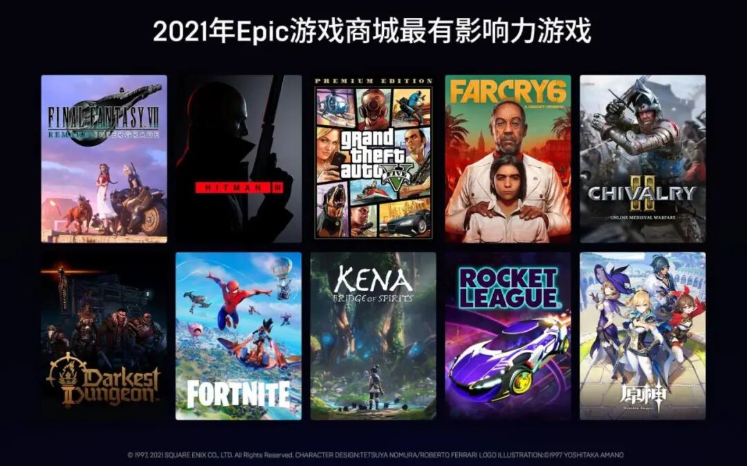 最后,根据Epic的总结,2021年,Epic游戏商城最具影响力的游戏分别《最终幻想7重制版》、《杀手3》、《给他爱5》、《孤岛惊魂6》、《骑士精神2》、《暗黑地牢2》、《堡垒之夜》、《柯娜:精神之桥》、《火箭联盟》、《原神》。