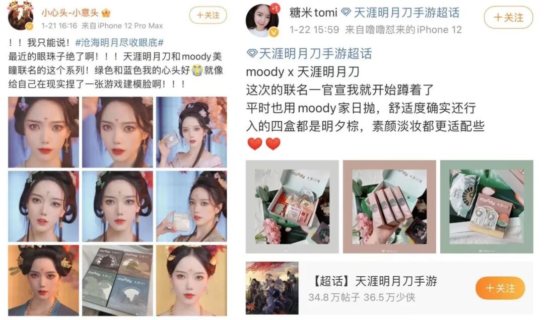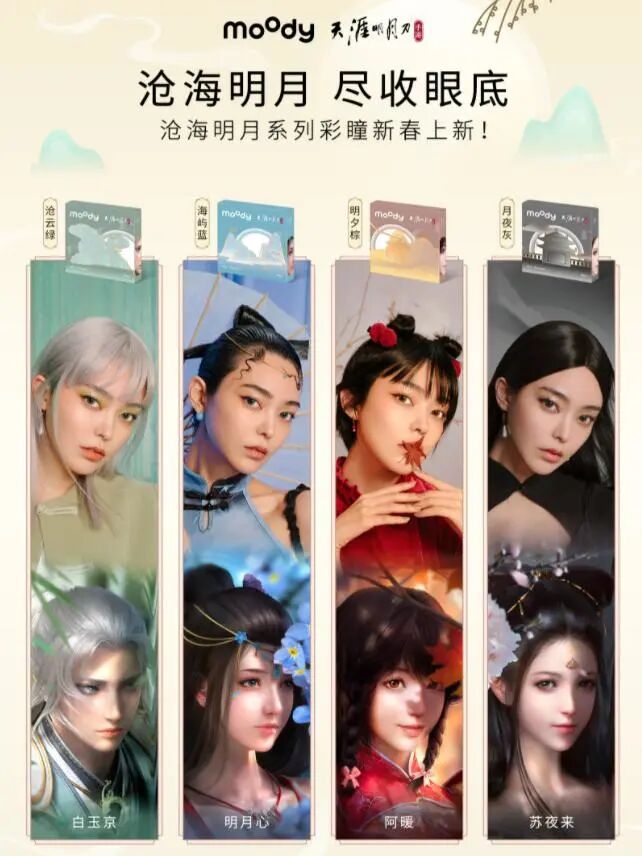 二则,在此之前的一个星期,moody宣布正式携手天刀手游,合作推出“沧海明月”系列联名彩瞳。产品上线当日,便售出超1000单,用户好评遍布微博与小红书。然而,合作双方并未像寻常联动一样,“合作到开卖为止”,而是继续探索着更深入的联动内容打造。