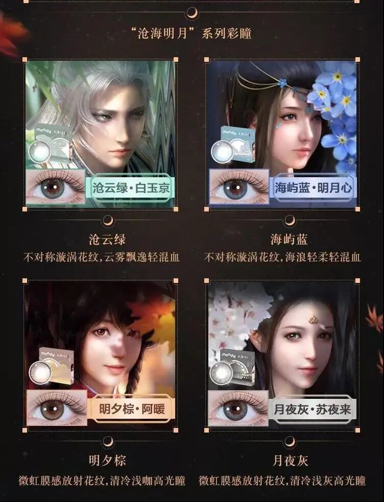 正因如此,moodyX天刀“沧海明月”系列的四款彩瞳,选择了根据天刀捏脸系统里的瞳色和瞳孔样式,1:1在现实中复刻。在此之前,moody主打“小直径”和“日常感”服务细分用户,而天刀手游内的出挑色泽与花样,则助力其拥有了更多选择,以及覆盖到天刀玩家的更广泛受众。