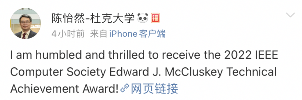 陈怡然教授也发微博表示自己很激动获得这次荣誉。