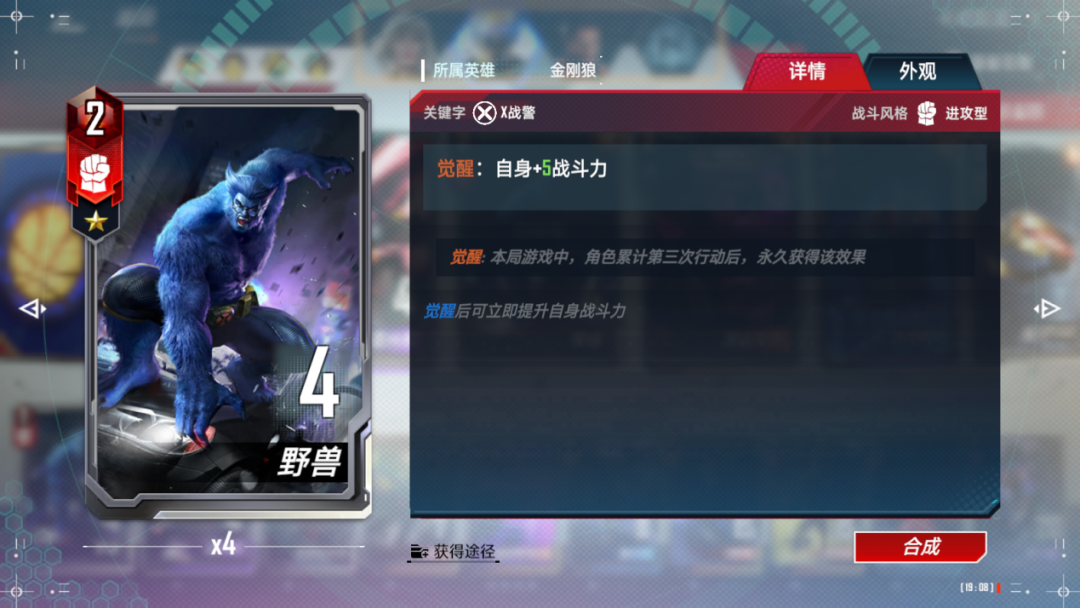 以“觉醒”这一机制为例,如果玩家想要用这项机制来应对敌人,那么最好的解决方案,就是以“金刚狼”这一角色为核心,构筑卡组。无论是三费还是五费的金刚狼,在场上都有着非常可观的存活能力。其词缀设计完美还原了漫画中金刚狼的能力——在不断受伤和自愈后,愈战愈强。当玩家为其装备了武器“金钢狼利爪”后,能大幅提升其攻击力,虽然相应也会对其自身造成伤害,但攻击后的治疗能力,能保证他在场上有着较强的存活能力。配合“天使”觉醒后为队友加上的“增伤”BUFF,能进一步提升金刚狼的战力,除非对面卡牌能直接秒杀金刚狼,否则他就将一直战斗下去。