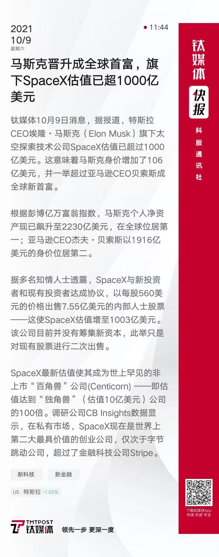 马斯克晋升成全球首富,旗下SpaceX估值已超1000亿美元
