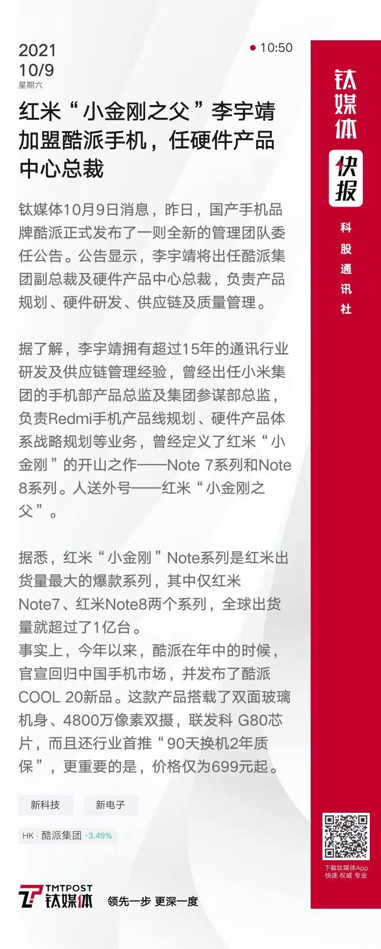 红米“小金刚之父”李宇靖加盟酷派手机,任硬件产品中心总裁