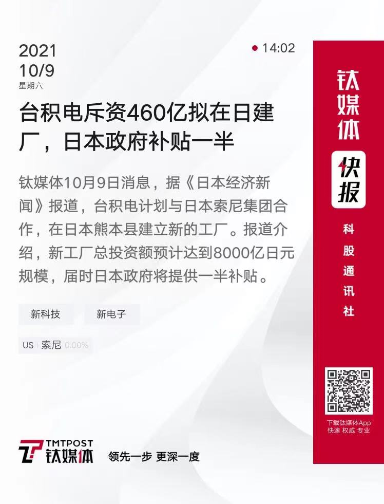 台积电斥资460亿拟在日建厂,日本政府补贴一半