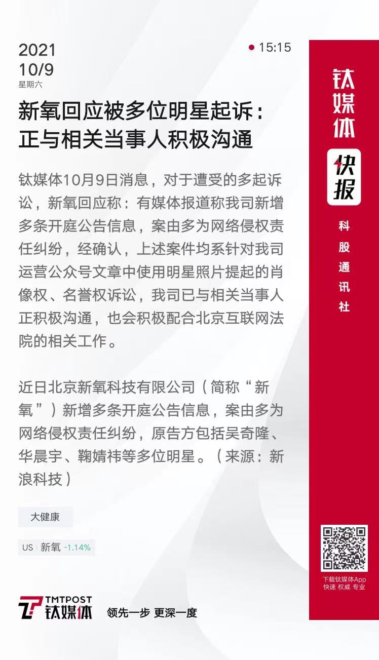 新氧回应被多位明星起诉:正与相关当事人积极沟通