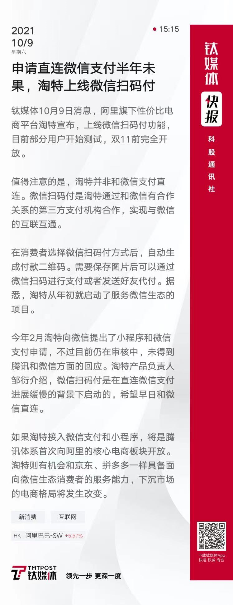 申请直连微信支付半年未果,淘特上线微信扫码付