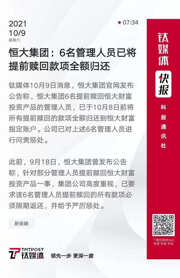 恒大集团:6名管理人员已将提前赎回款项全额归还