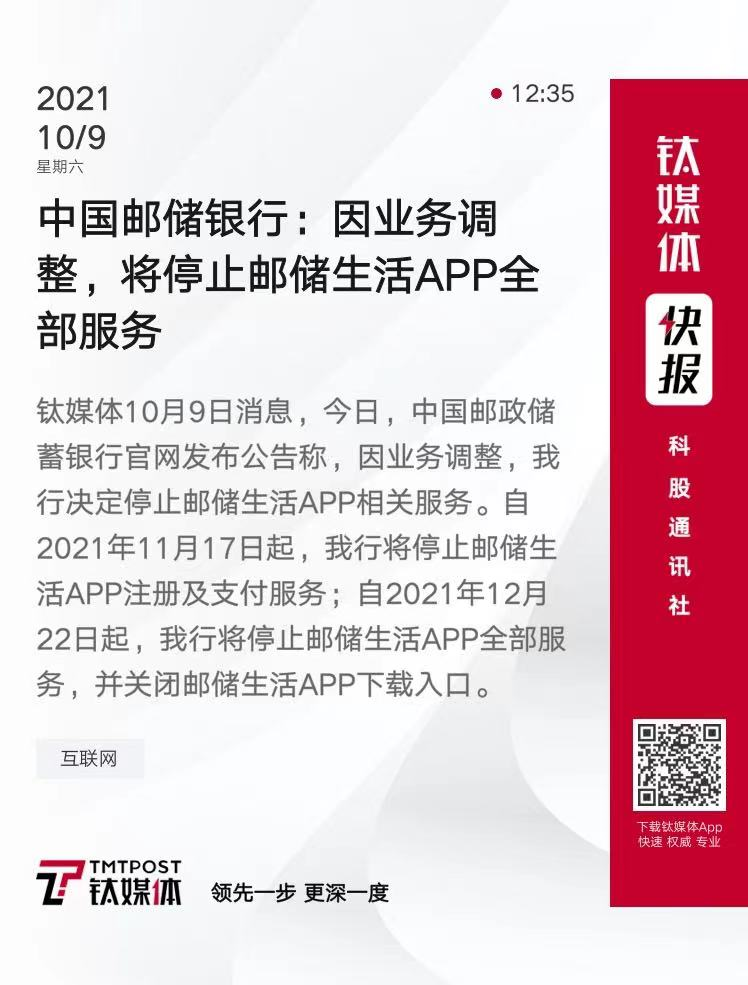 中国邮储银行:因业务调整,将停止邮储生活APP全部服务