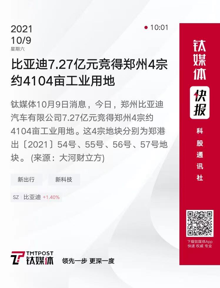 比亚迪7.27亿元竞得郑州4宗约4104亩工业用地