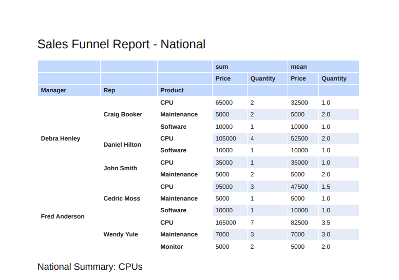 为了生成更有用的报告,我们将结合上面显示的汇总统计数据,并将报告拆分为每个经理包含一个单独的 PDF 页面