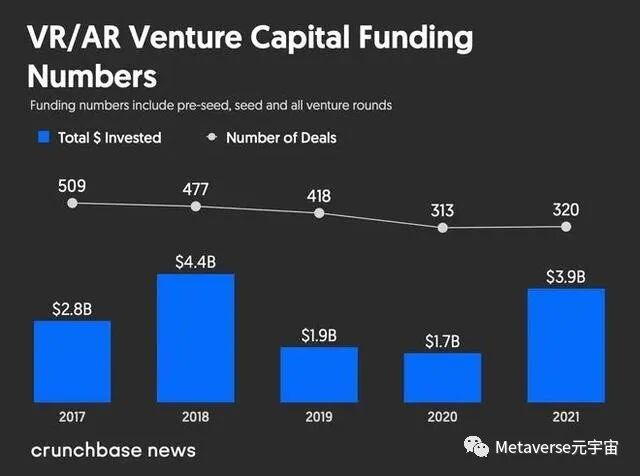 数据还显示,第四季度风险投资增长帮助2021年成为VR/AR投资第二高的年份,有近39亿美元风险投资进入初创企业,仅次于2018年。当时,由于Magic Leap和商汤等公司进行大规模融资,该领域的风险投资接近44亿美元。