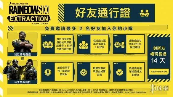 事实上,这个试玩版主要是为了跟“好友通行证”配套使用,假如你的好友购买了《彩六异种》完整版本,那么他会获得2个“好友通行证代币”,可以邀请2个好友跟他一起玩。如果你没买游戏、只下载了试玩版,又收到了“好友通行证代币”,那么你就能跟好友一起畅玩14天《彩六异种》,这期间只要你跟好友同时在线,那么2小时倒计时就会暂停。