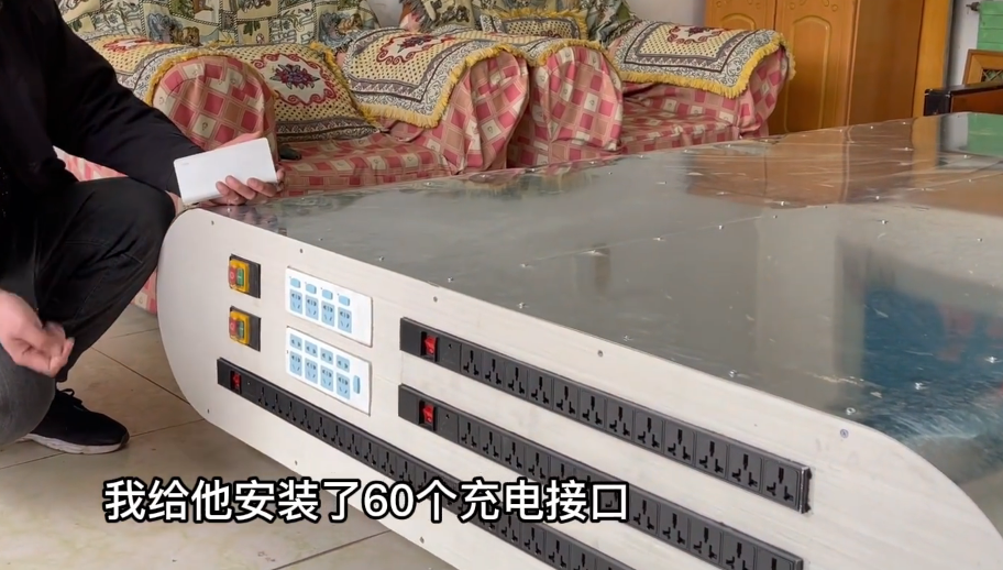 手工耿介绍,这个充电宝配备了 60 个充电口,而且多数是标准三插,可以直接使用手机、笔记本自带的 220V 充电器。因为夸张的容量,这个移动电源甚至还能充电瓶车、电视、洗衣机等。(来源:快科技)