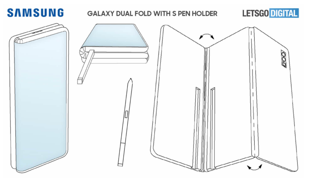 专利图显示,这是一款双折叠屏设备,包括一个向内一个向外的转轴,由此组成了「Z」形的折叠状态。在转轴的背后,有两个可以容纳手写笔的凹槽,在折叠状态下,这两个凹槽刚好能够「夹住」S-Pen 手写笔。这款双折叠屏手机搭载了三摄影像系统,其中还包括一枚潜望长焦镜头。(来源:IT 之家)