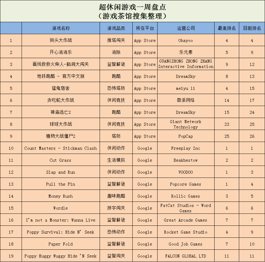 超休闲游戏方面,在App Store免费游戏榜单中,Ohayoo发行的推塔游戏《狗头大作战》空降榜首。在Google Play免费游戏榜单中,老游戏《Count Masters - Stickman Clash》登上榜首。