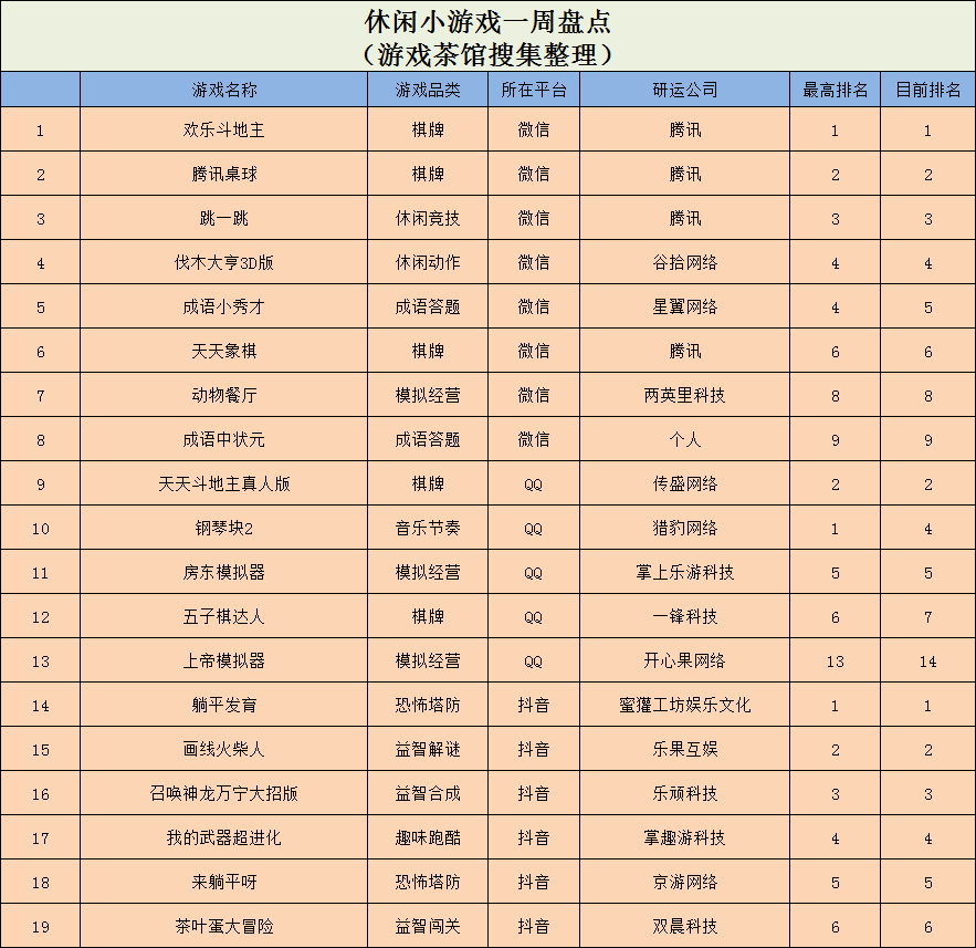 休闲游戏榜单方面,在微信小游戏中,经典游戏《欢乐斗地主》依然分别拿下榜单第一。QQ小游戏榜单中,棋牌游戏《天天斗地主真人版》再次登顶榜首。抖音小游戏方面,蜜獾工坊娱乐的《躺平发育》连续第二周稳坐榜首。