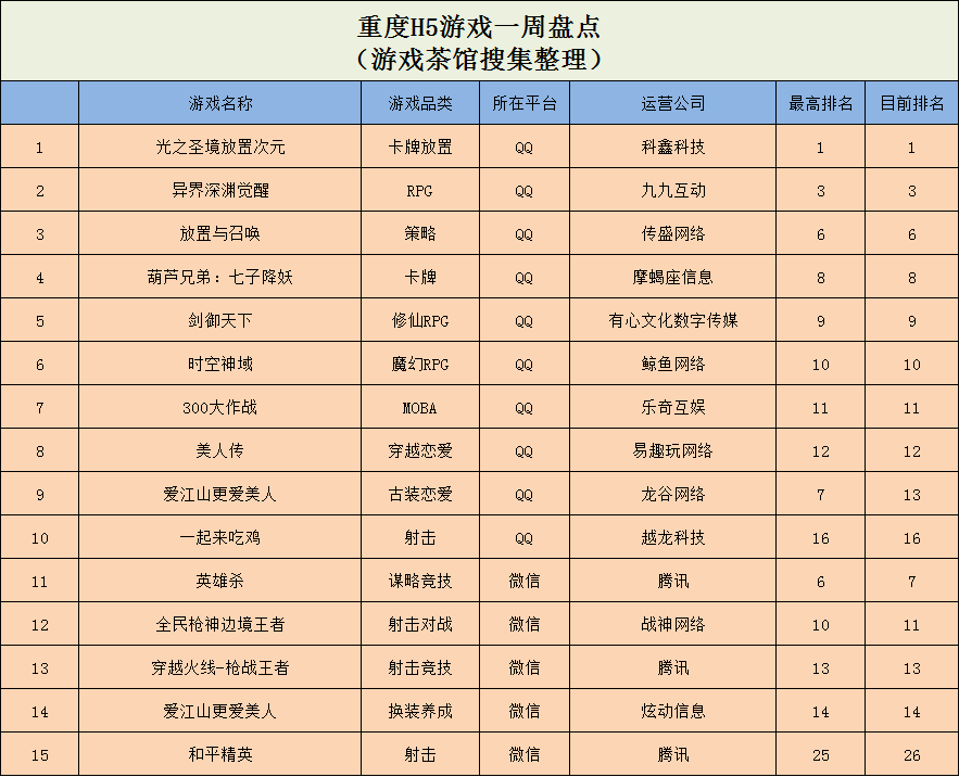 重度游戏方面,QQ小游戏榜单中,科鑫科技《光之圣境放置次元》登顶。微信小游戏中,经典小游戏《英雄杀》拿下榜单第一。